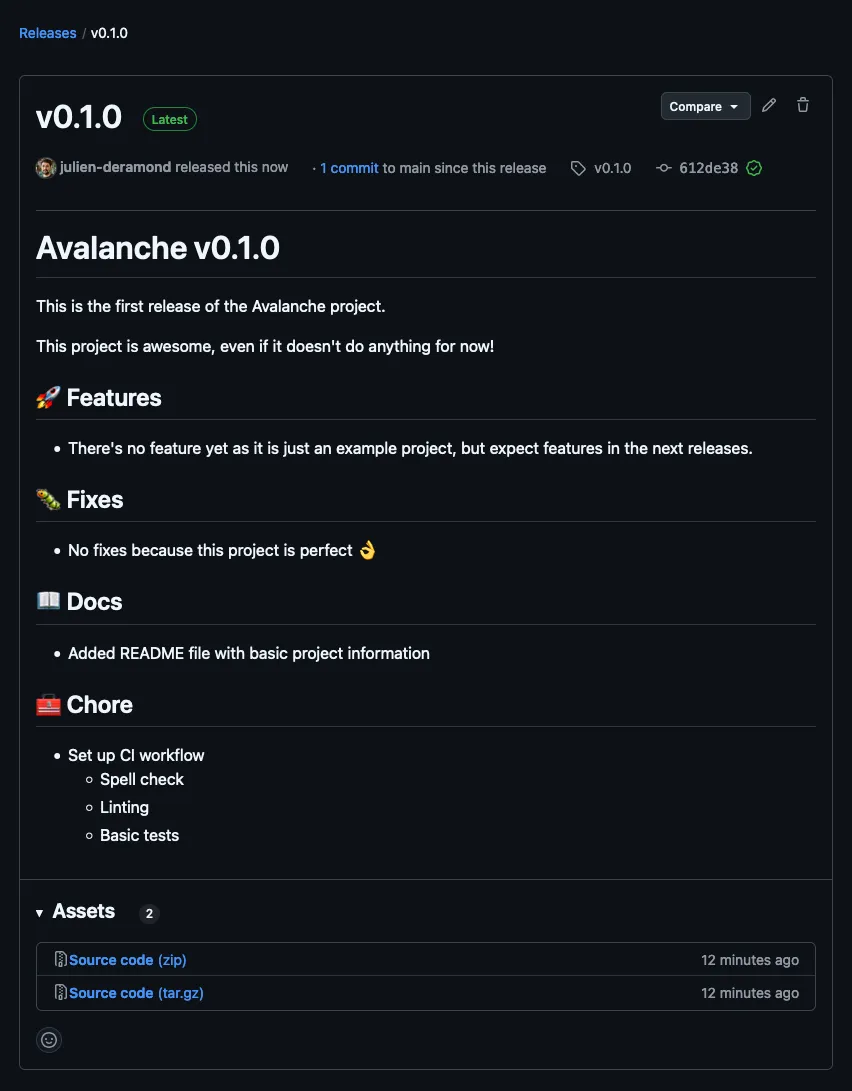 CHANGELOG.mdfile in your repository.Here’s an example for your first release: