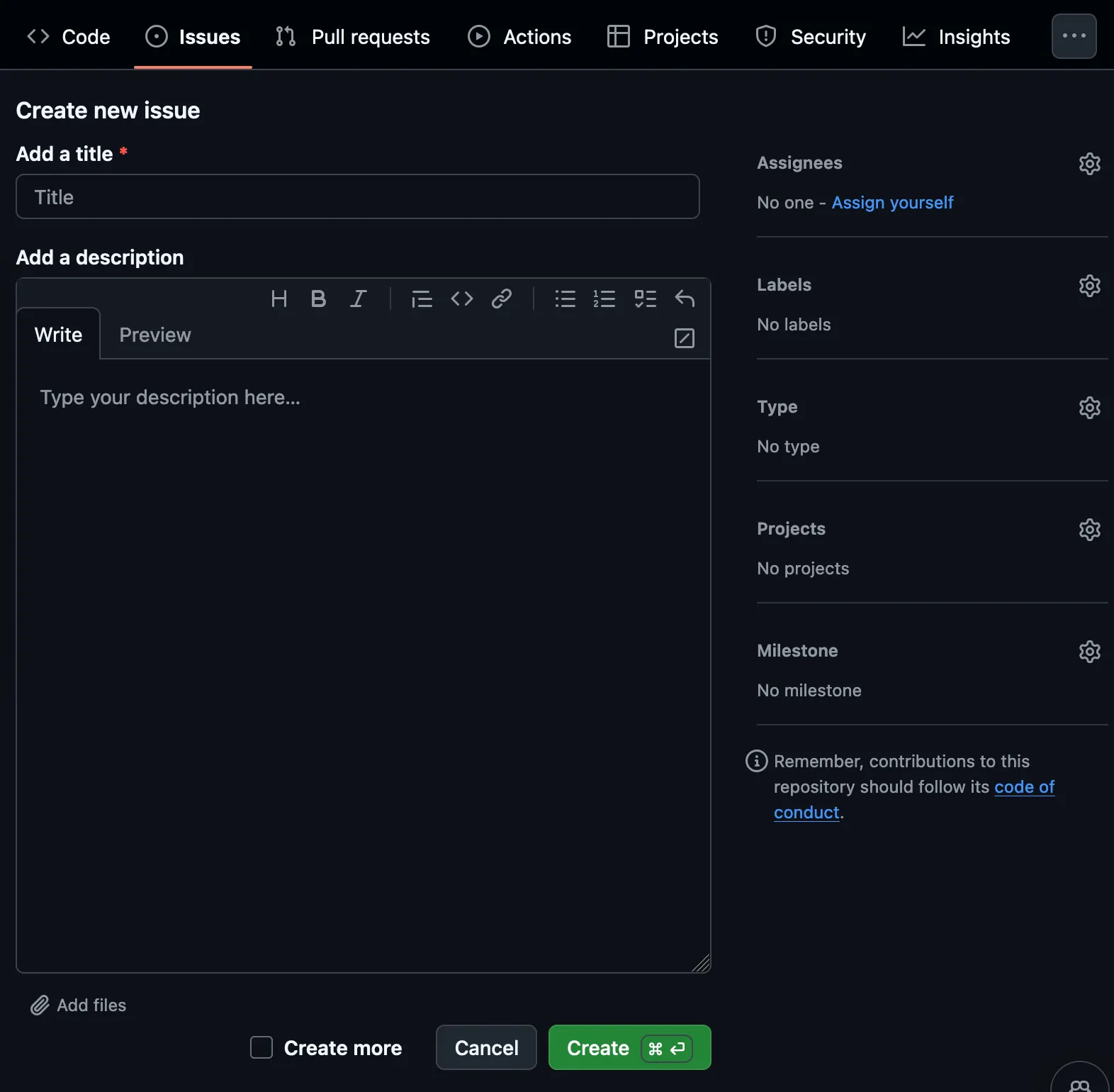 Issuestab in your repository and then clicking on theNew issuebutton. -