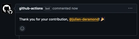 .github/workflows/thank-you.yml name: 'Thank Contributor'on:pull_request:types: [closed]jobs:thank-you:if: ${{ github.event.pull_request.merged == true }}runs-on: ubuntu-lateststeps:- name: Send Thank You Commentuses: actions/github-script@v7with:script: |github.rest.issues.createComment({issue_number: context.payload.pull_request.number,owner: context.repo.owner,repo: context.repo.repo,body: "Thank you for your contribution, @${{ github.actor }}! 🎉"})This action will post a thank-you message in the pull request when it’s merged.